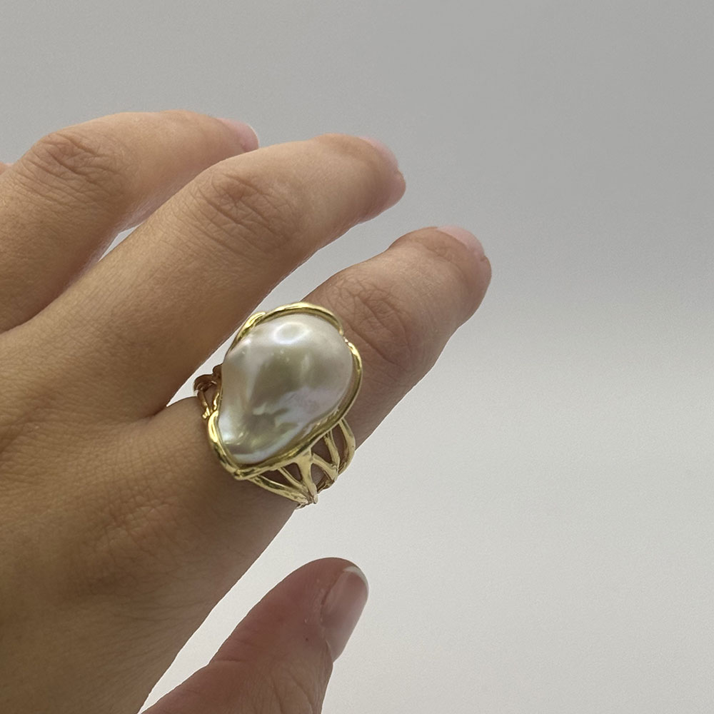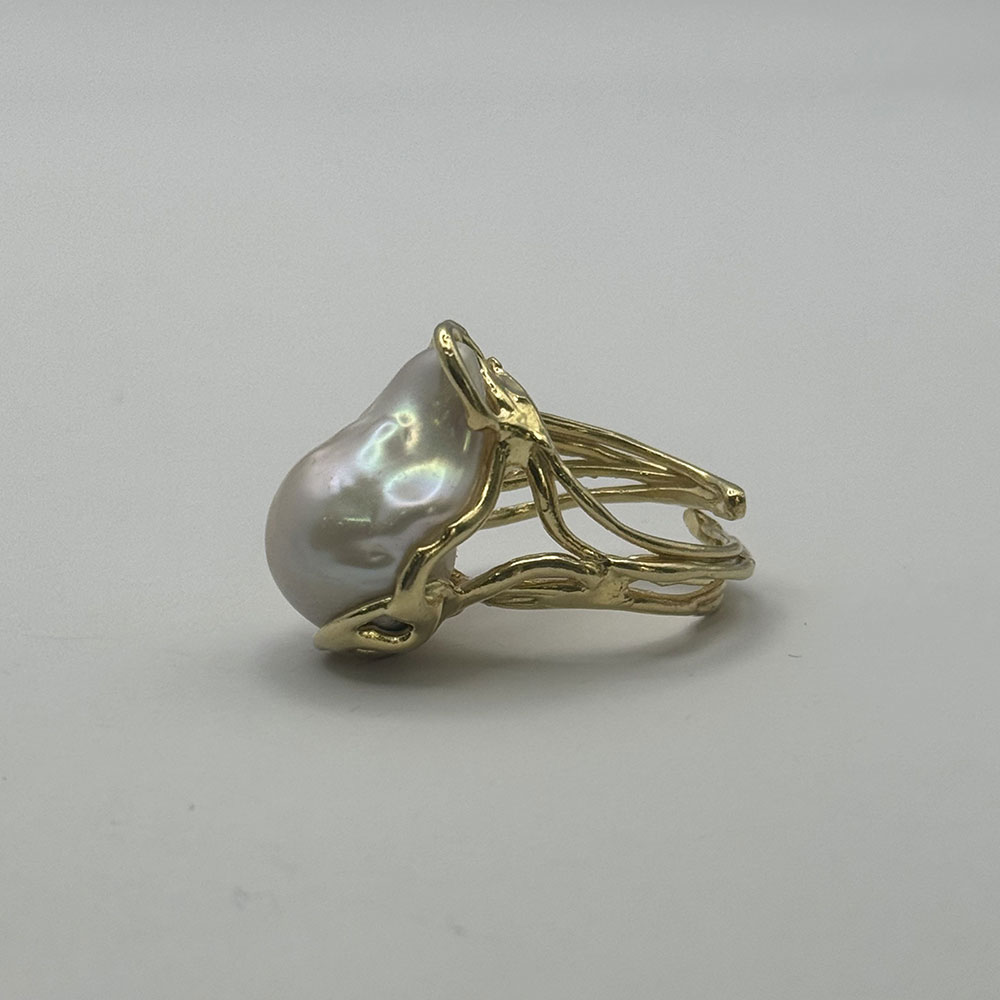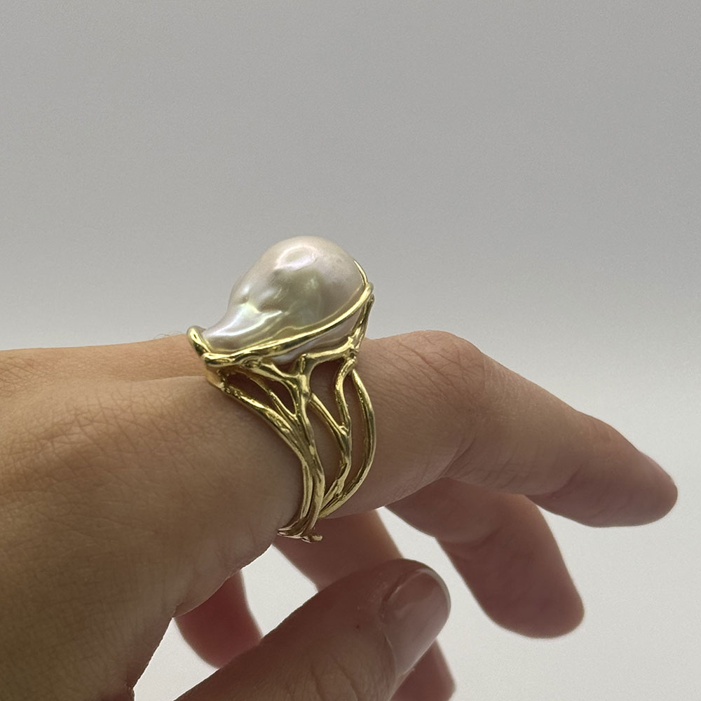 Maxi anillo regulable de plata de ley 925 con baño de oro 18k y perla barroca cultivada 2,5×1,5 cm