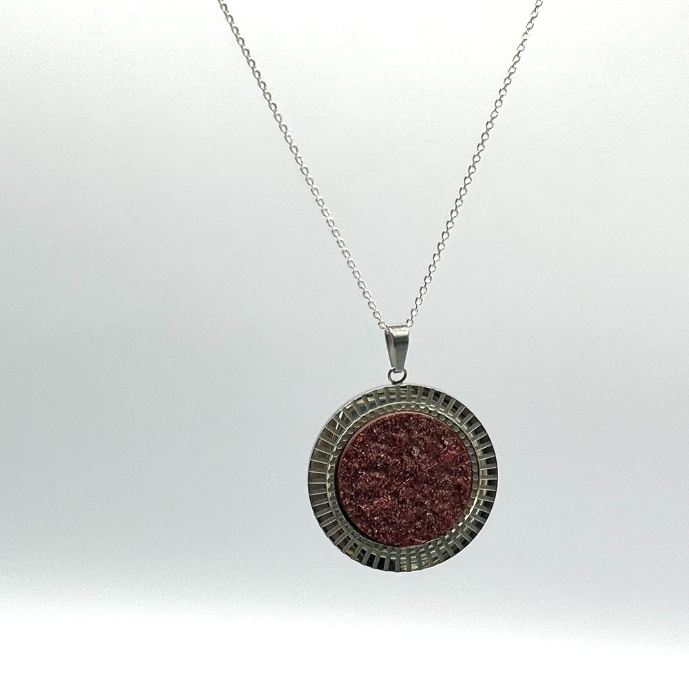 Collar con fina cadena de plata de ley 925 y medallón de acero inoxidable con pieza de cristal que recuerda a los tártaros del vino.