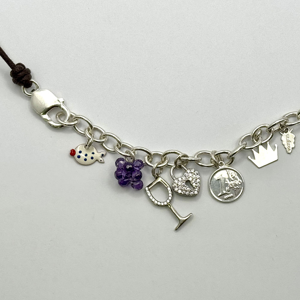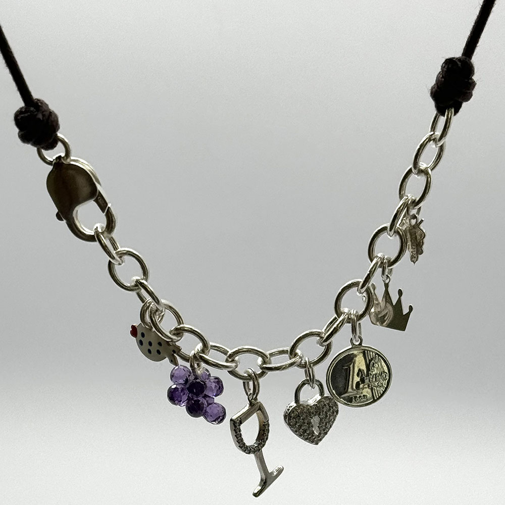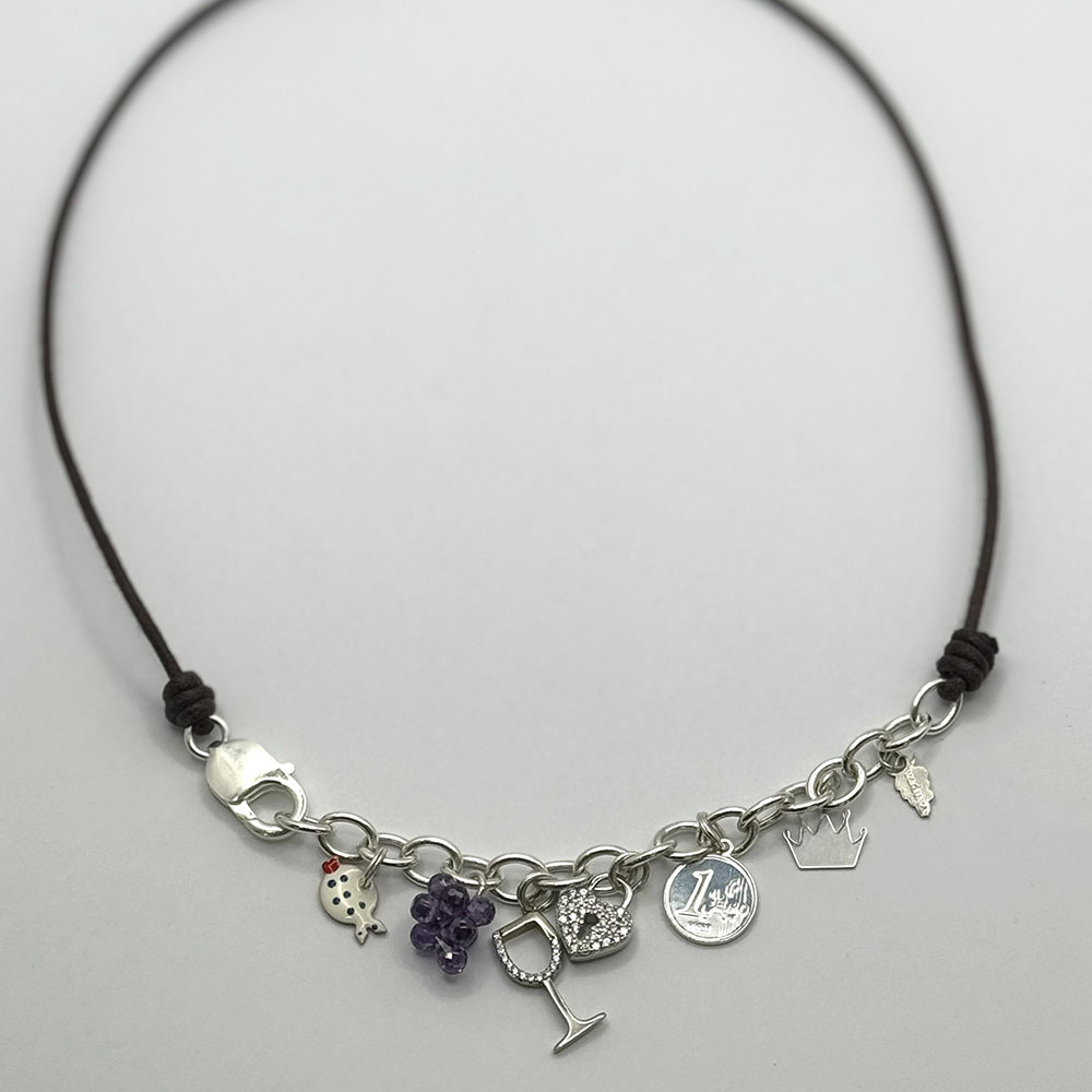 Original collar de algodón encerado con nudo corredizo y cadena y charms de plata de ley 925