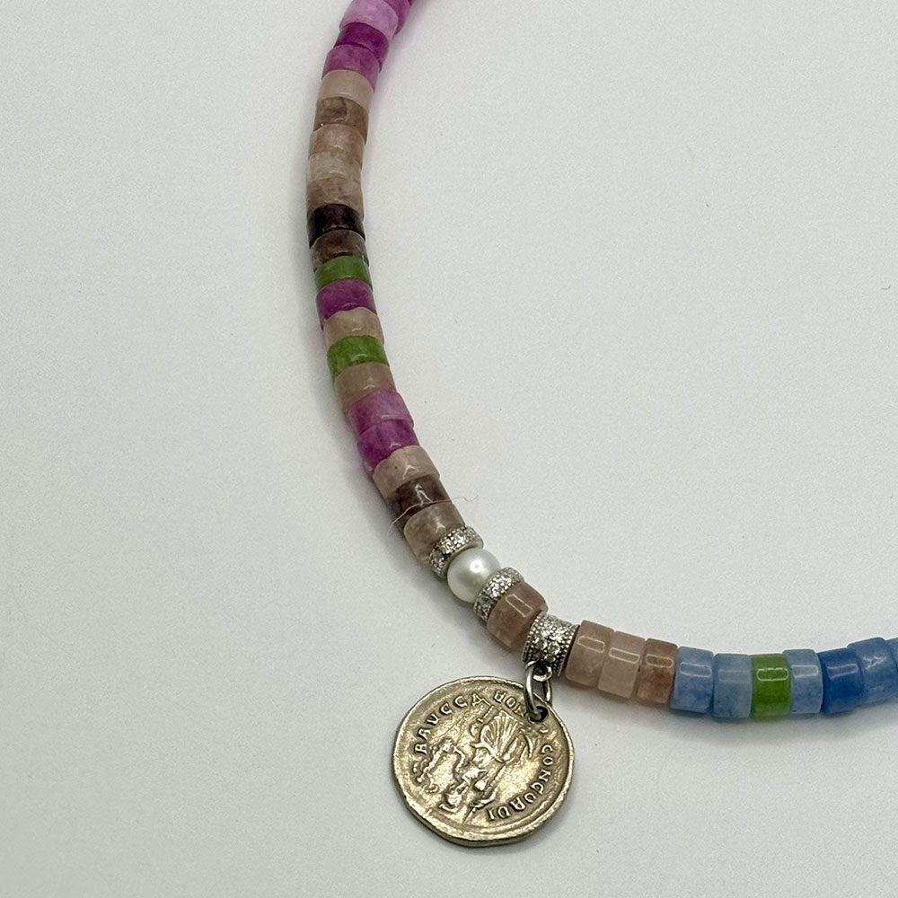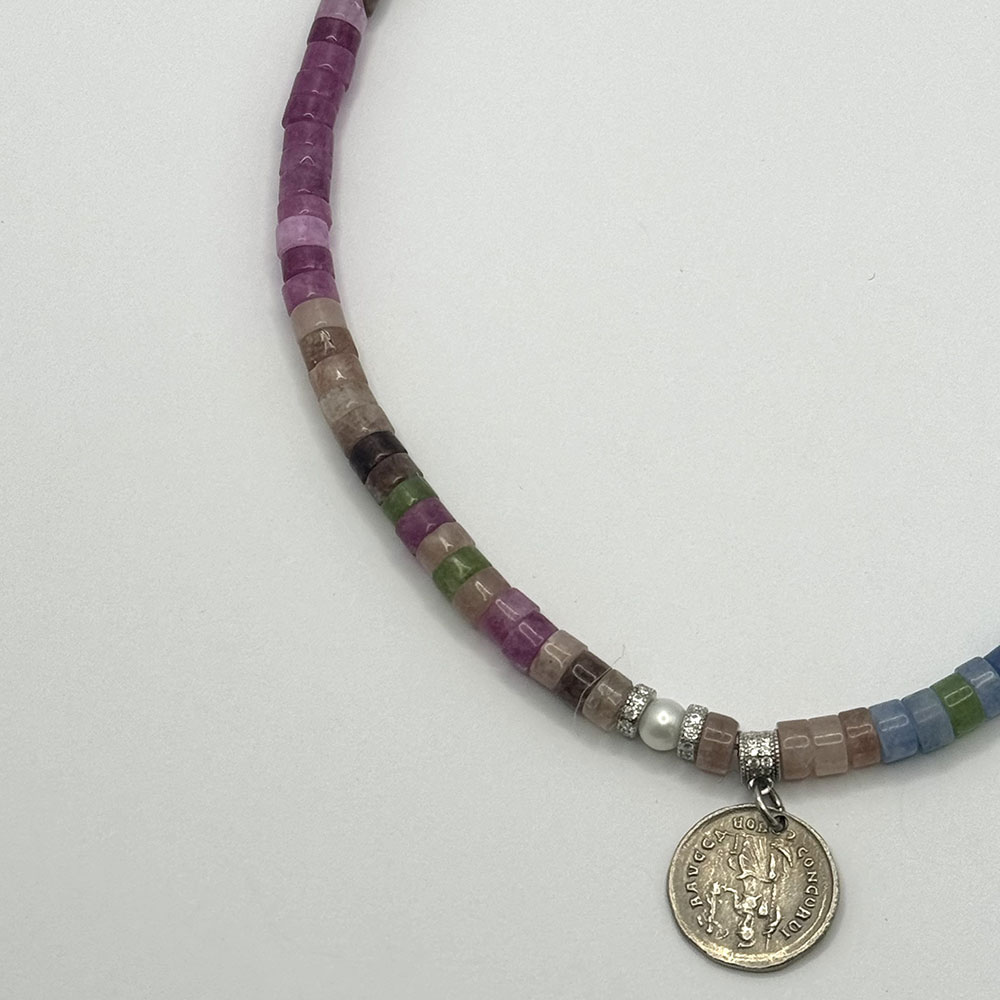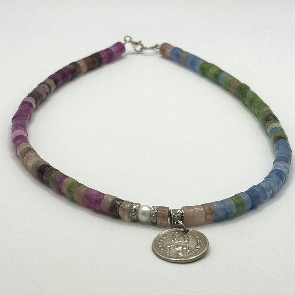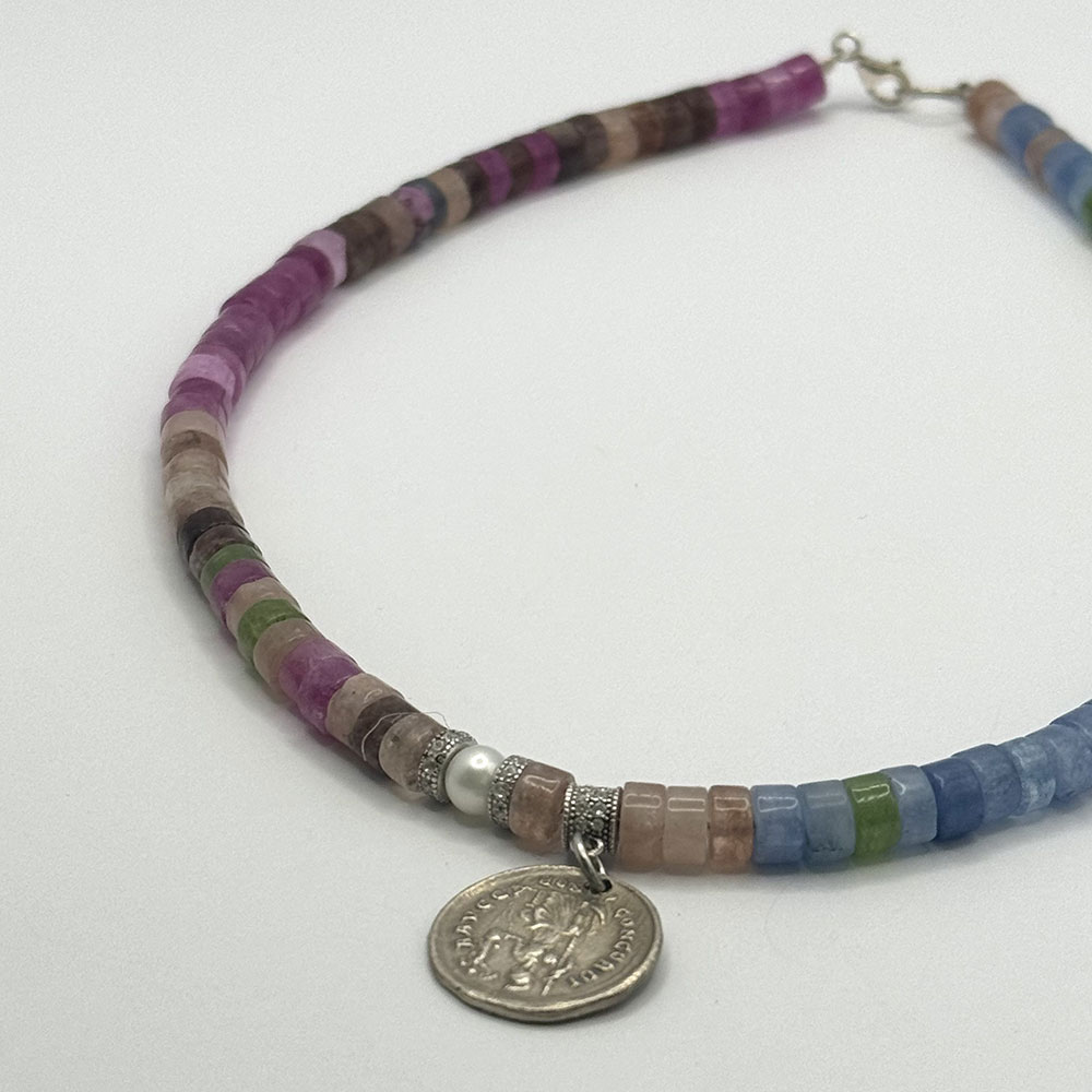 Collar de turmalinas de 45 cm, cierre de plata de ley y colgante moneda de plata de ley
