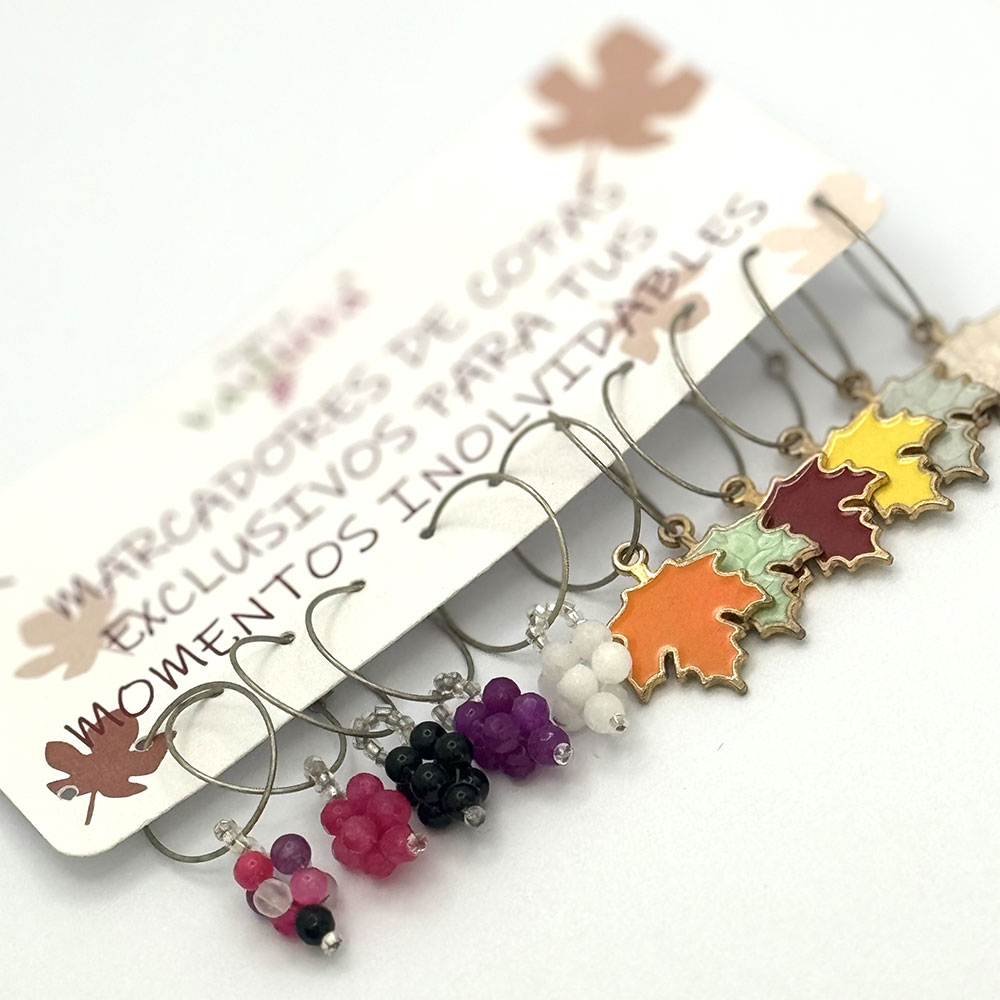 Kit de marcadoras de 12 unidades. 6 de ellos con nuestra uva Vaduva de ágatas de 4mm y 6 de hoja de parra de distintos colores