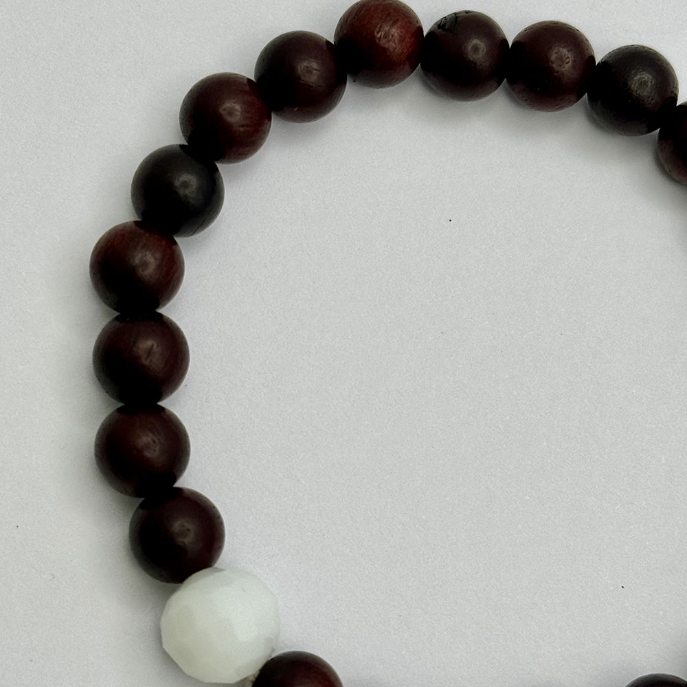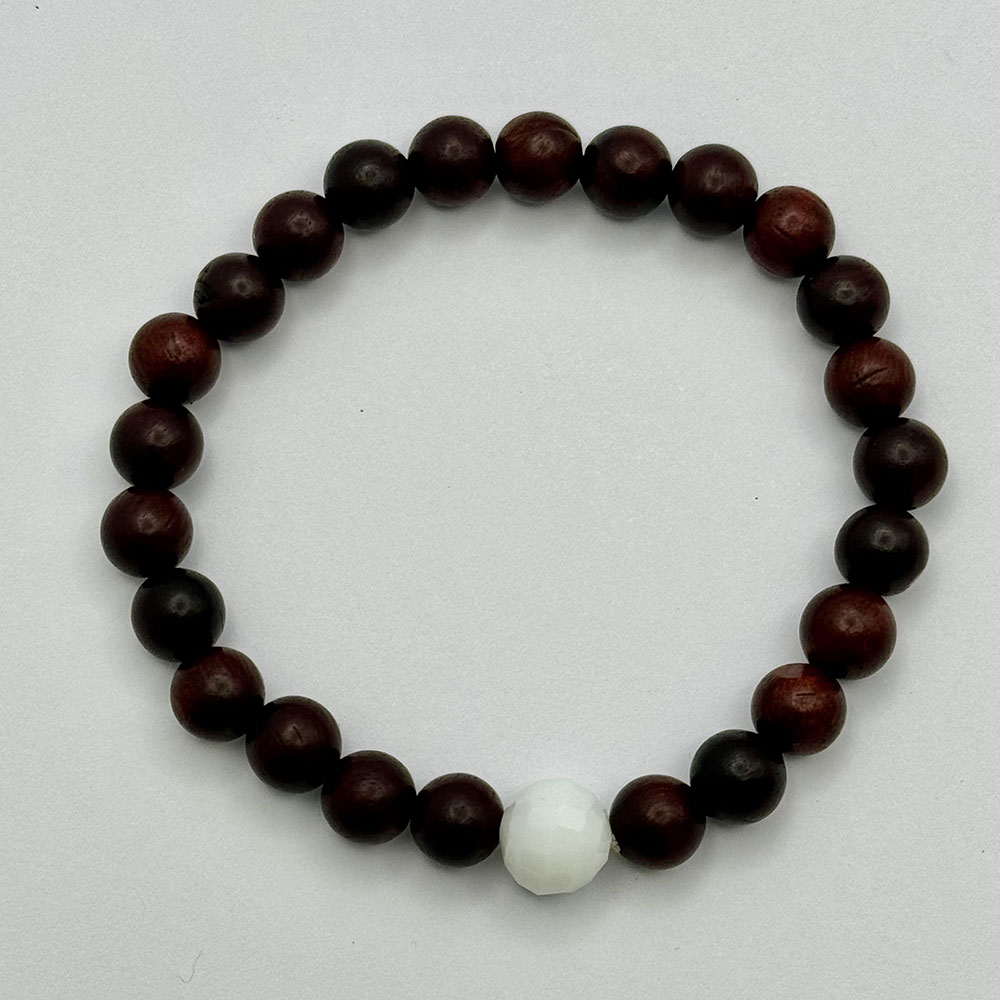 Pulsera elástica ajustable con bolas de madera y bola blanca de ágata semejando a una bola de golf