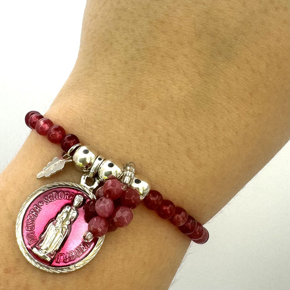 Pulsera elástica ajustable de ágatas granates , virgen de Valvanera de plata, bolas de 6 mm de plata y uvita Vaduva de ágatas de 4mm
